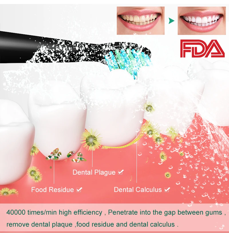 40000 times / min high efficiency , Penetrate into the gap between gingival , remove dental plaque , food residue and dental calculus .