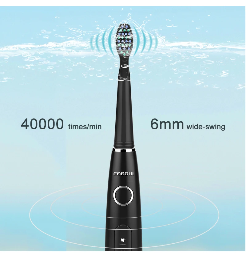 Up to 40000 vibrations / minutes , 6mm wide swing , The vibrations will penetrate into the gap between gums , remove dental plaque , food residue , coffee stains , deeply clean the entire oral cavity .