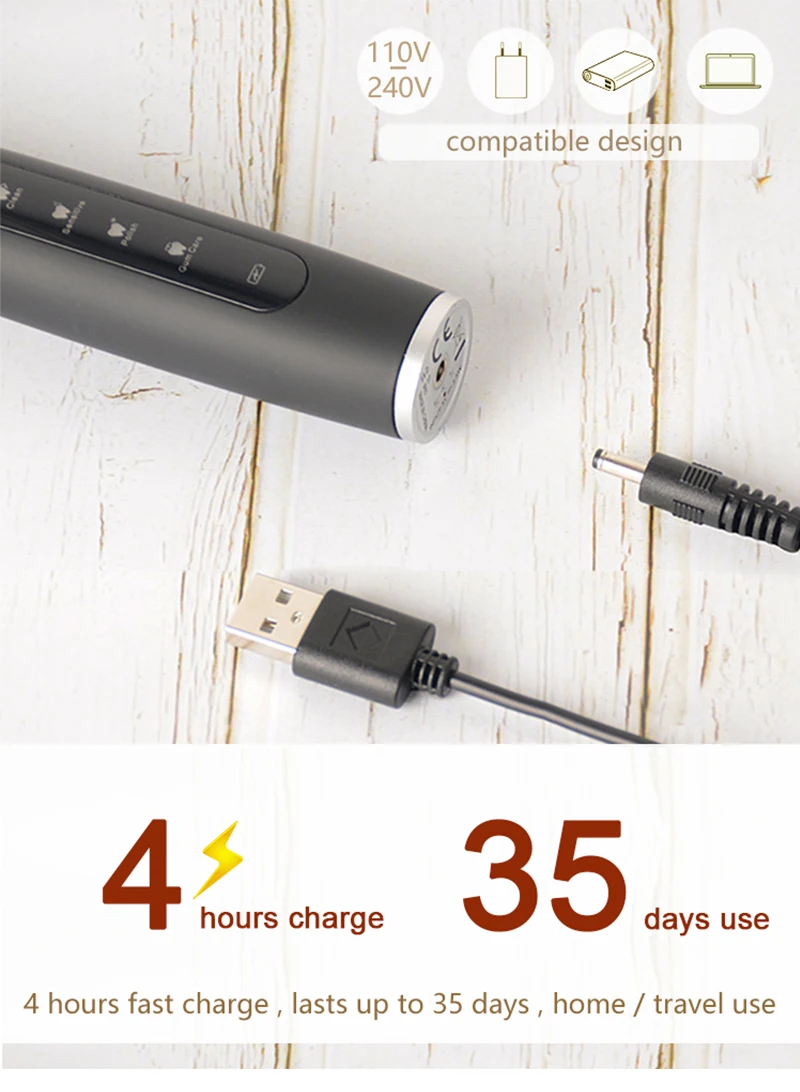 4 hours fast charge , can be used for 35 days long . it's the thoughtful design for both home use and travel use .