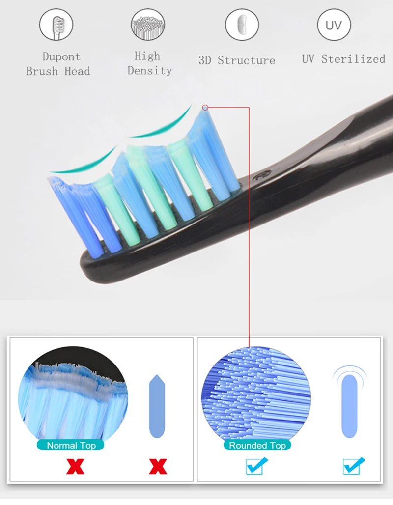 We have made great efforts in the toothbrush head part: select DuPont 0.152mm brush filaments, implant bristles in a sterile environment, and polish the top of the bristles into a round shape to maximize the protection of the gingival .