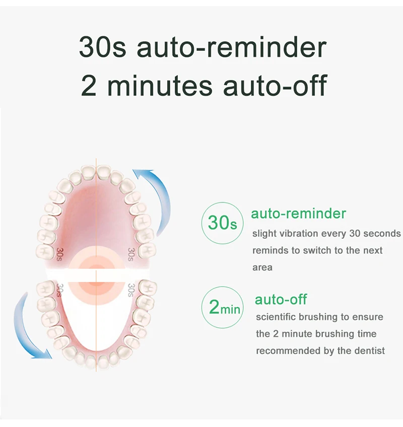 Smart Chip , slight vibration every 30 seconds reminds to switch to the next area , 2 minutes auto-off , enjoy the most scientific and healthy teeth care ~