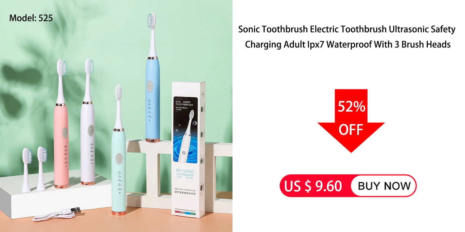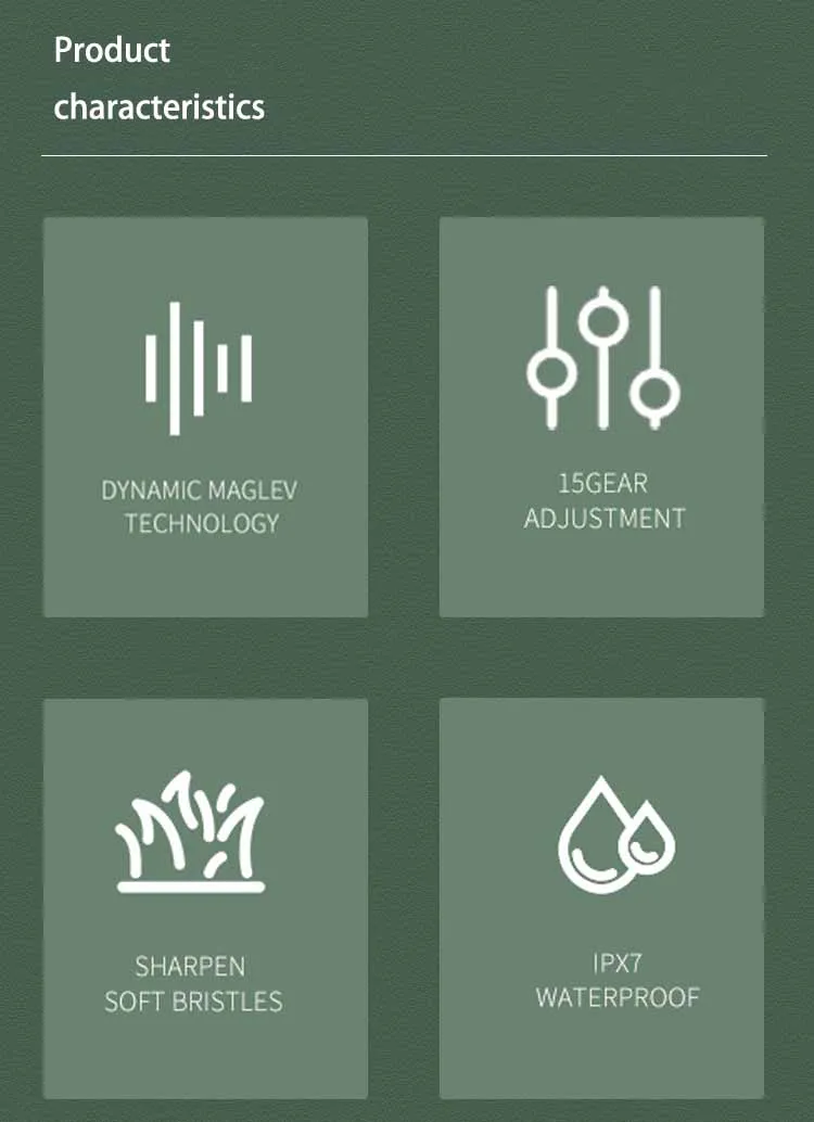 Basic configuration of the product: 1 handle, 3 cleaning brush heads, charging cable